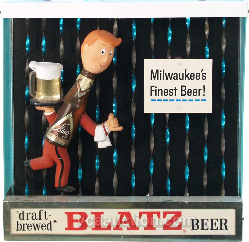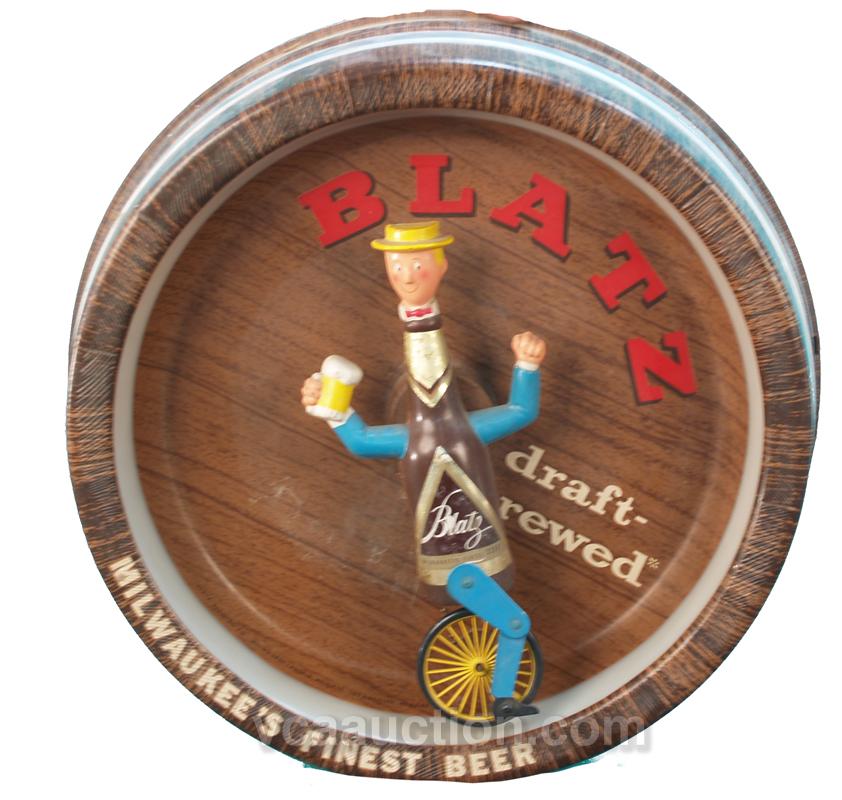 Lot Of 2 Blatz Beer Advertisement Motion Signs: 1 - Blatz Beer guy on unicycle riding around barrel & 1 - Blatz Beer guy w/ colorful moving background