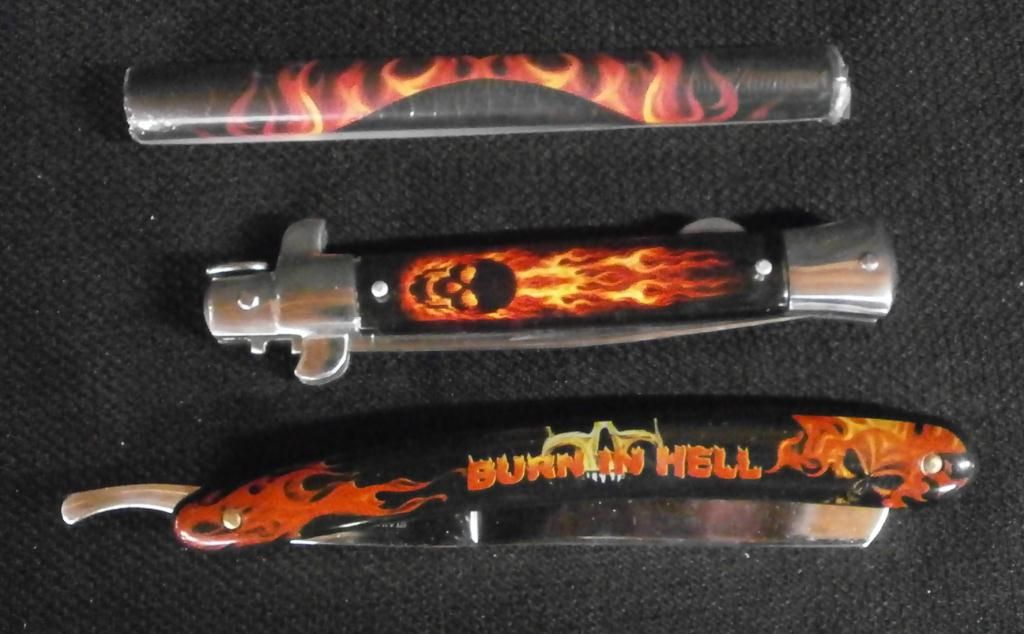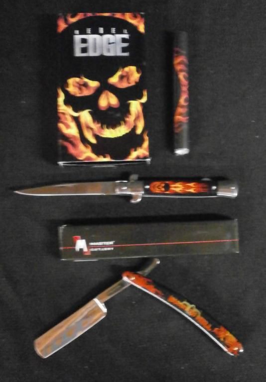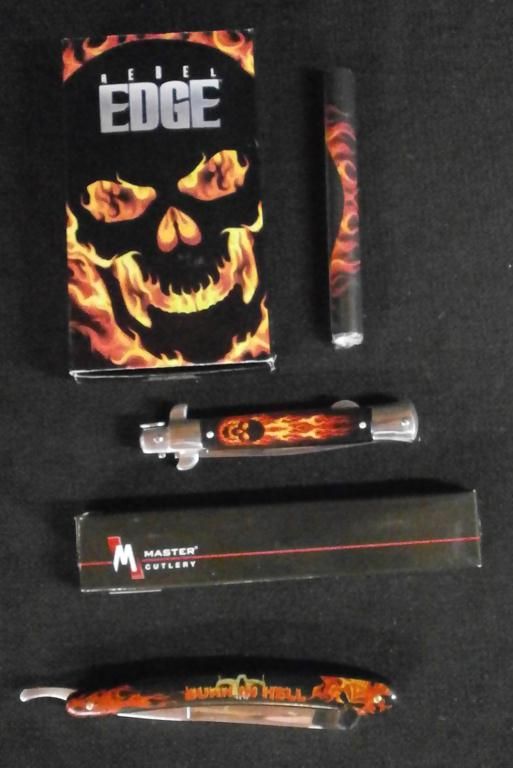W/Stainless Steel Blade W/Painted Black Flames, Black Handle W/Burn In Hell Logo & Flames. Rebel Edge Black Out Skull Stiletto Folding Knife W?Stainless Steel Blade & Handle W/ Artwork & Matching 7" x 5" Poster Of Enlarged Artwork.
