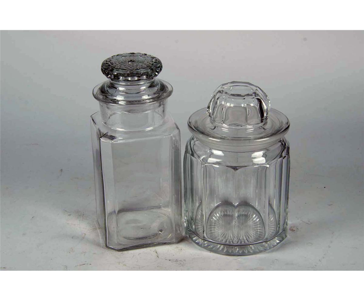Including 1 - ten-sided (decahedral) candy jar with ornate lid and 1 - candy jar embossed, "Kis-me gum" Condition (Excellent). Size Largest 11" x 5" x 5"