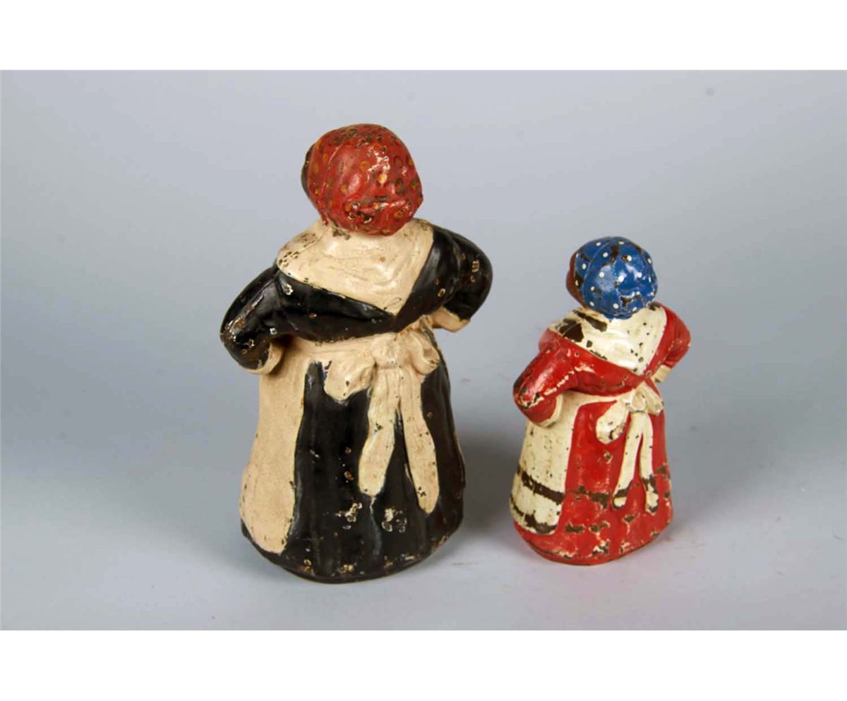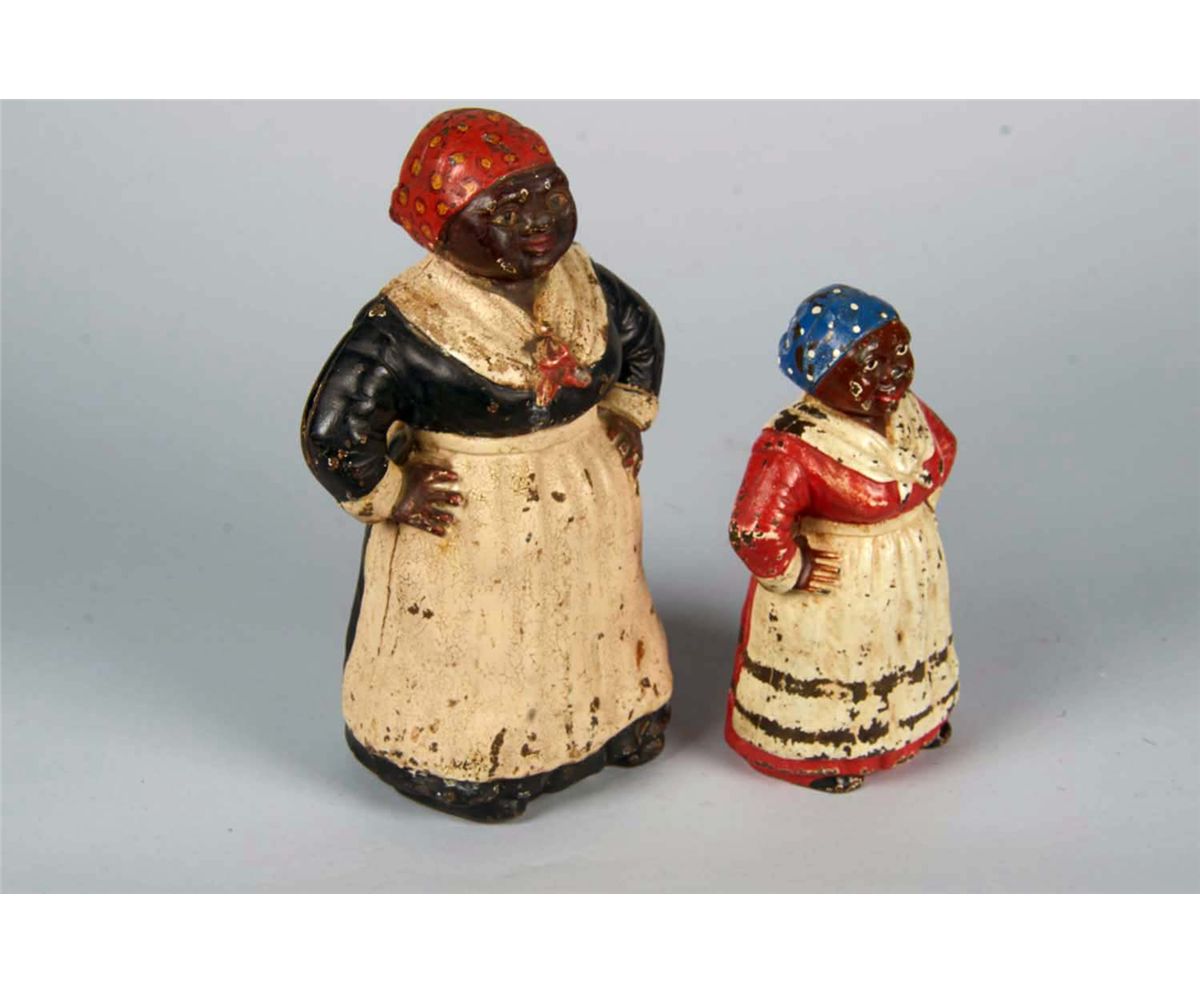 Black Americana items including 1 - with red dress and blue polka dot scarf, no markings inside (9" tall) and 1- with black dress and red polka dot scarf, stamped Copyright Hubley (12" tall). Both have paint chips throughout. Condition (Good). Size Larges