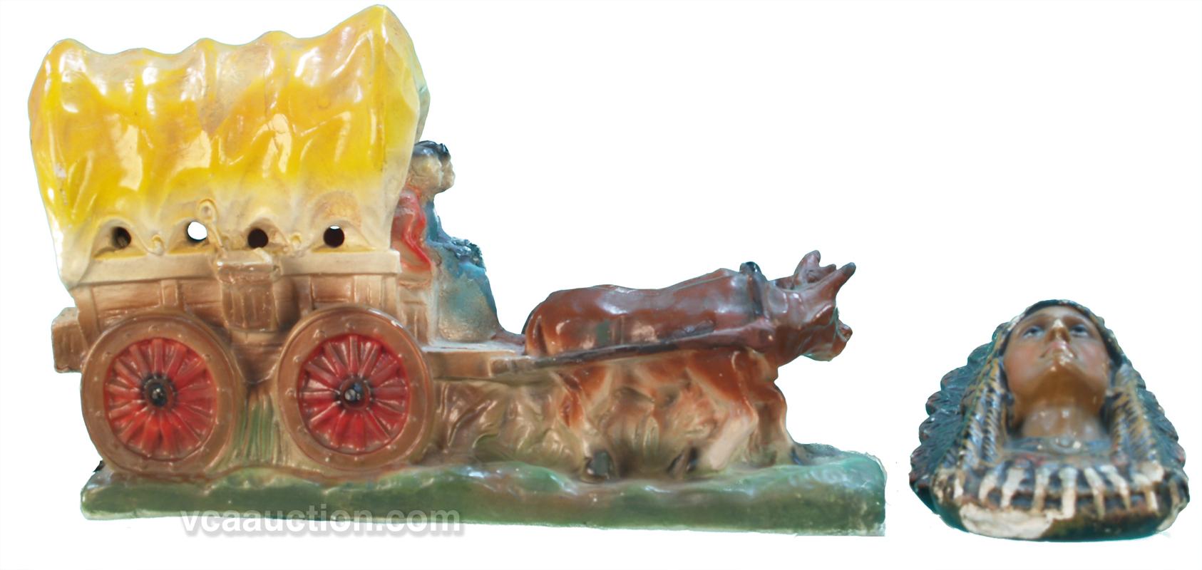 Lot Of 2 Chalkware Items: Covered Wagon Lamp, Works & Indian Maiden Face C. 1900.