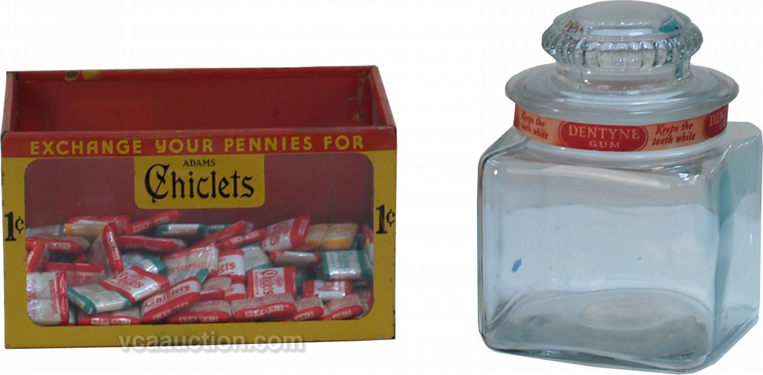 Lot Of 2 Chewing Gum Items: 1 - Dentyne Gum glass jar w/ lid & 1 - Chiclets Gum countertop tin & glass display box for holding gum packets w/ gum packets