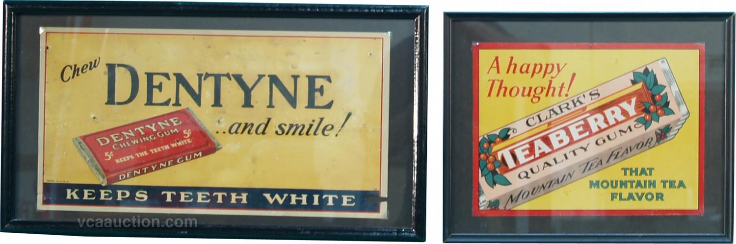 Lot Of 2 Chewing Gum Tin Signs In Frames: 1 - Clark's Teaberry - 12" x 9" & 1 - Dentyne - 18" x 9"