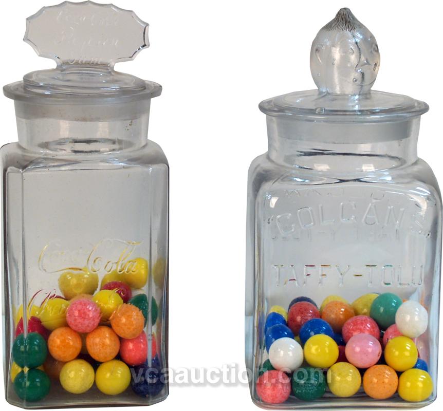 Lot Of 2 Country Store Countertop Embossed Glass Jars w/ Lids: 1 - Coca Cola Chewing Gum - 11" tall & 1 - "Colgan's" Taffy-Tolu - 11" tall