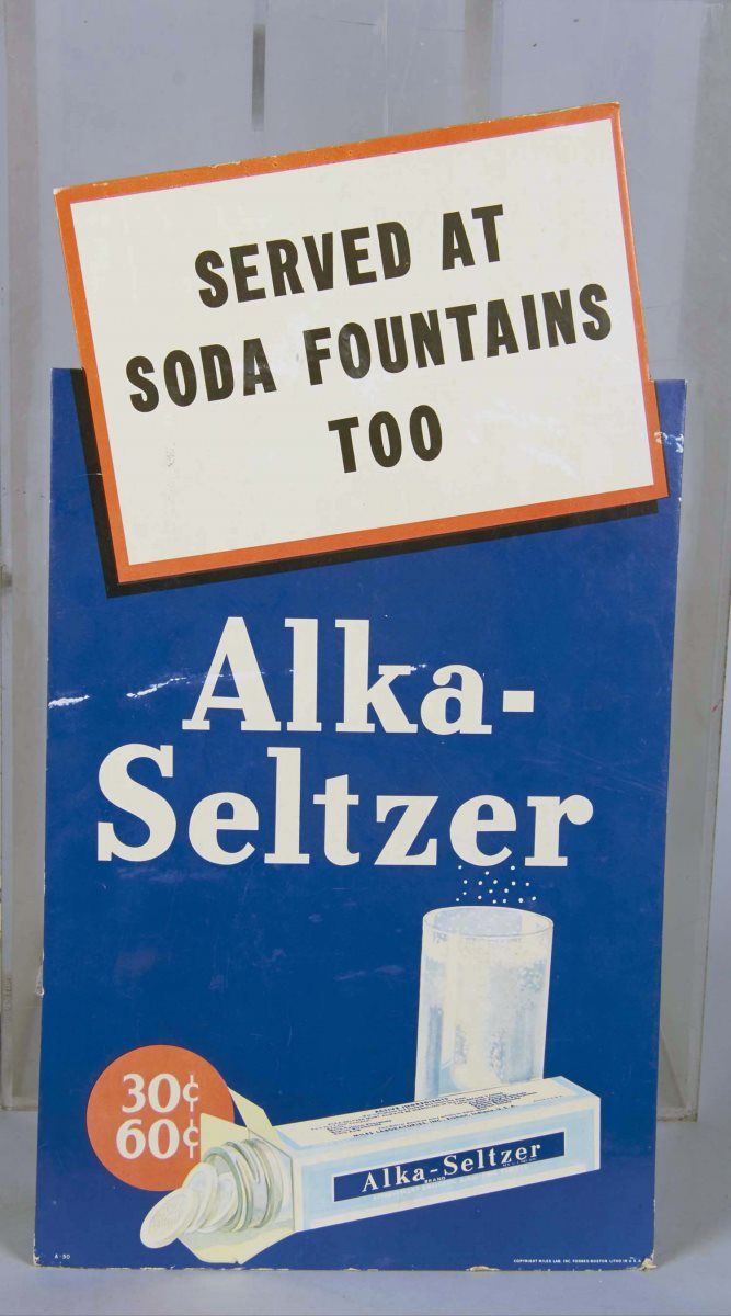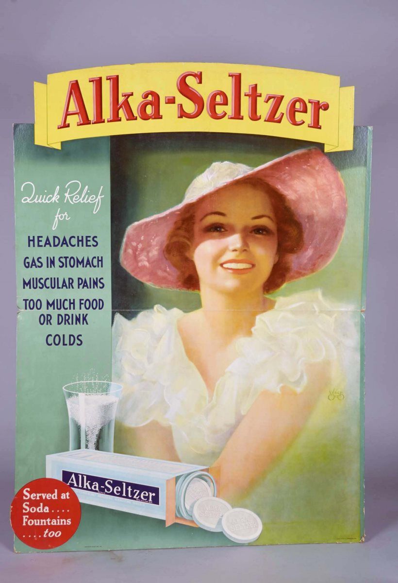 Including 1 - "Alka-Seltzer Quick relief for headaches, gas in stomach, muscular pains, too much food or drink, colds", and 1 - Alka Seltzer "Served at Soda Fountains." Condition (Very good). Size Largest 29-1/2" x 40-3/8"