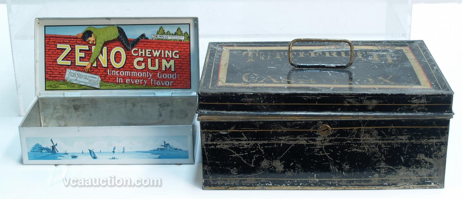 Lot Of 2 Early Country Store Countertop Tin Boxes: 1 - Zeno Chewing Gum & 1 - Tutti Frutti Cash Box