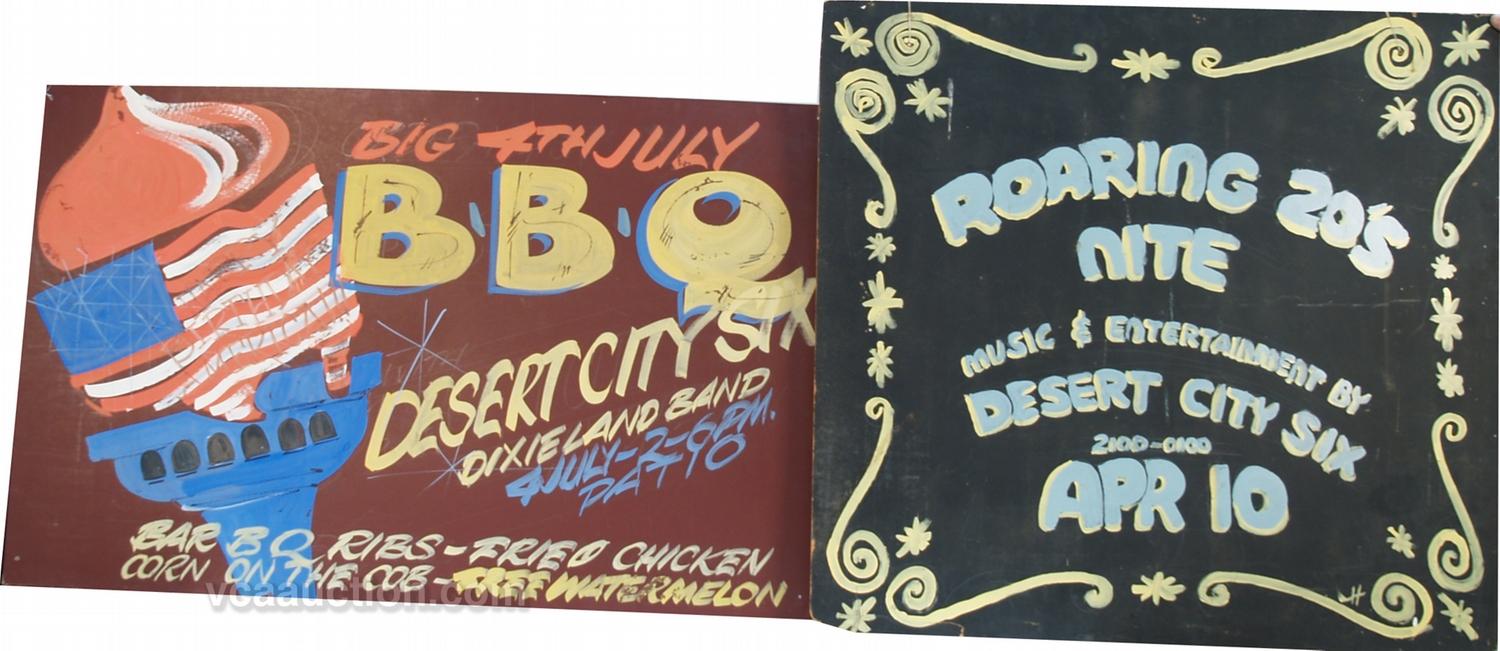 Lot Of 2 Early Event Posters: 1 - "Roaring 20's Nite" heavy cardboard handpainted sign - 36" x 33" & 1 - "Big 4th July BBQ" cardboard handpainted sign - 44" x 28"