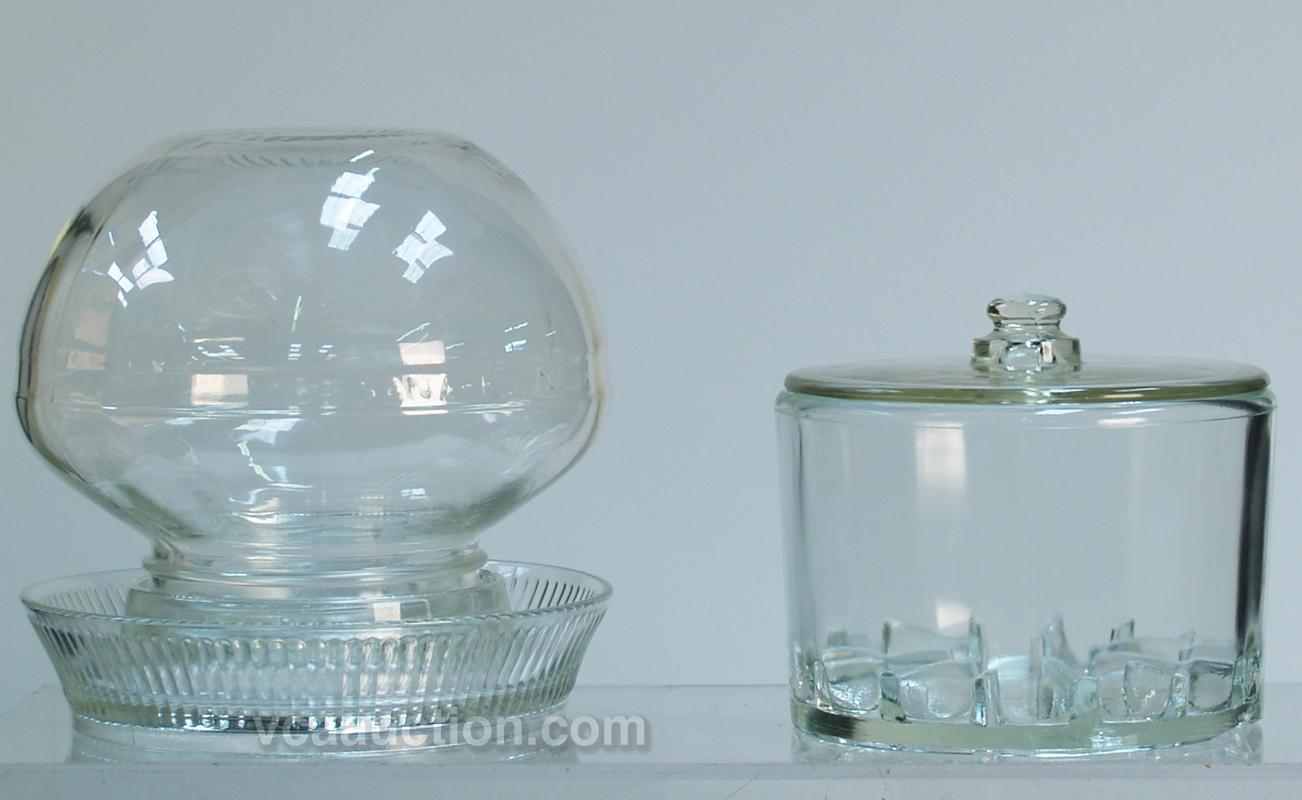 Lot Of 2 Early Glass Items: 1 - 2-piece chicken feeder & 1 - "Sanitary Cheese Preserver" cheese jar w/ lid, used to keep cheese from molding
