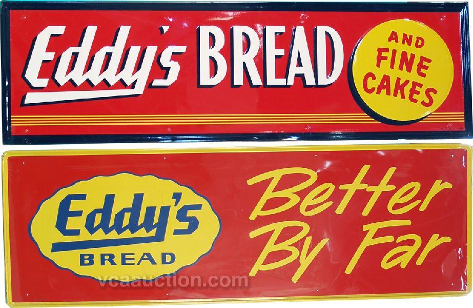 Lot Of 2 Eddy's Bread Tin Signs, 1 - "And Fine Cakes" embossed tin sign - 54" x 16" & 1 - "Better By Far" tin sign - 54" x 18"
