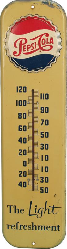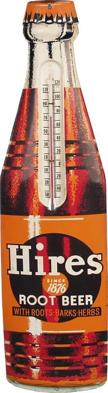 Lot Of 2 Embossed Tin Signs w/ Thermometer's: 1 - Hires Root Beer die-cut - 8" x 29" & 1 - Pepsi-Cola - 8" x 28"