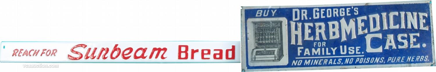 Lot Of 2 Embossed Tin Signs: 1 - "Reach For Sunbeam Bread" - 19" x 2" & 1 - "Dr. George's Herbmedicine Case" - 14" x 5"