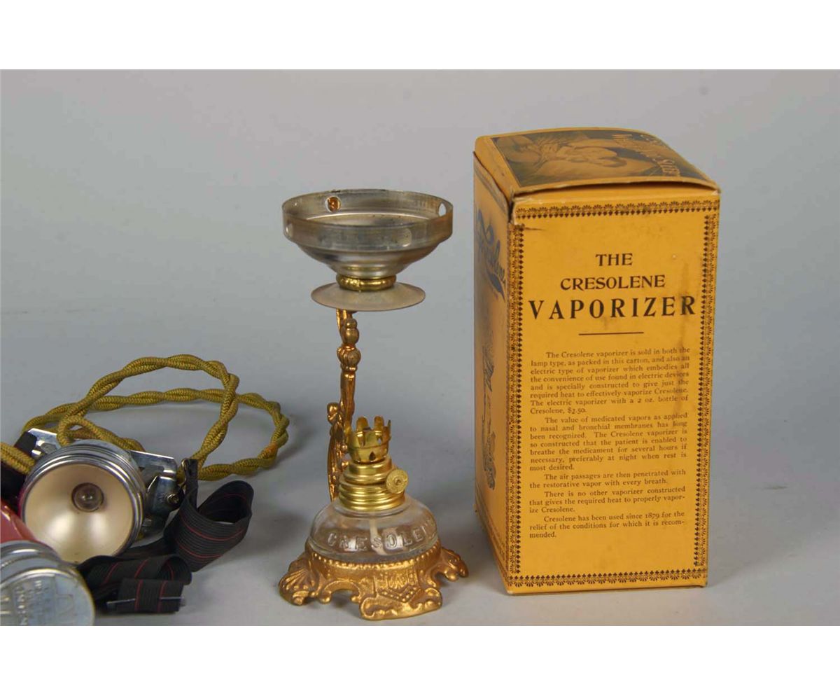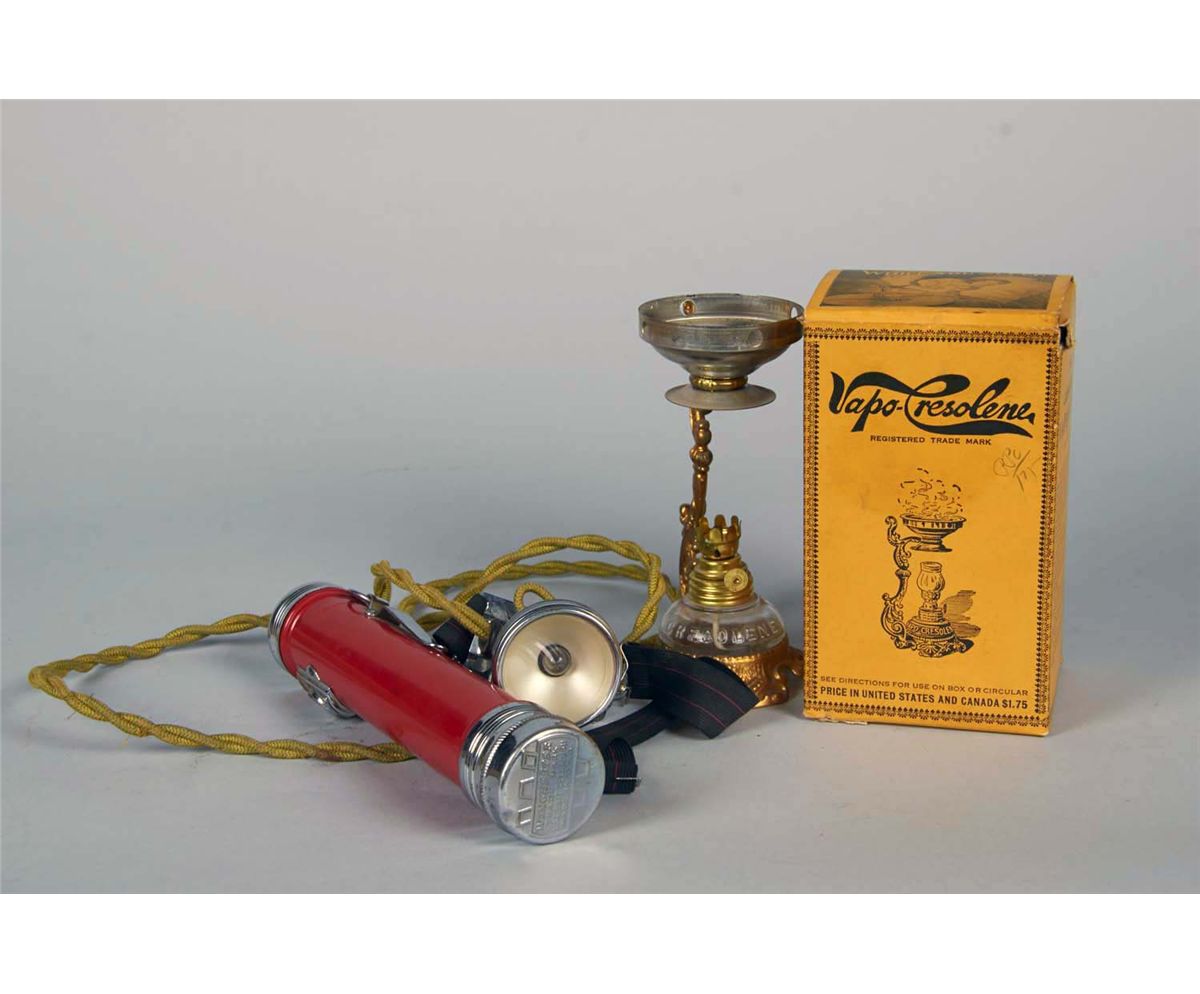 Including 1-Nickel plated and red painted Winchester Brand 3 D cell powered Forester's flashlight with head mount and 52" power cord, includes spare battery. Inside looks clean without corrosion, body is stamped U.S.F.S. for United States Forestry Service
