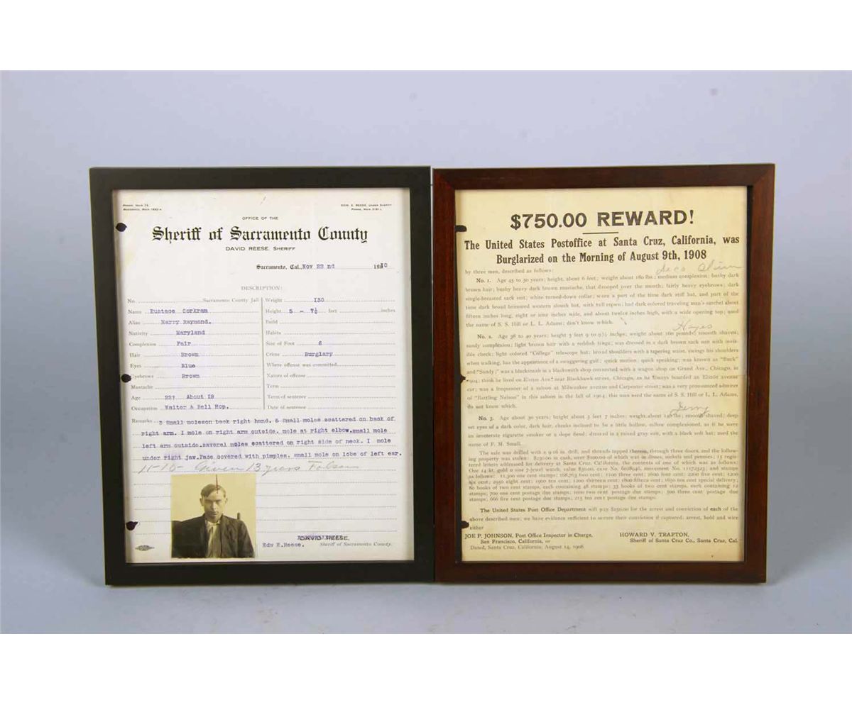 Including 1 - $750.00 reward for Santa Cruz, CA post office burglarized in 1908, describes 3 suspects, their MO and 1 - from Sacramento, CA Sheriff for Eustace Corkram with photo circa 1910. Condition (Very good). Size 12" x 9.5"