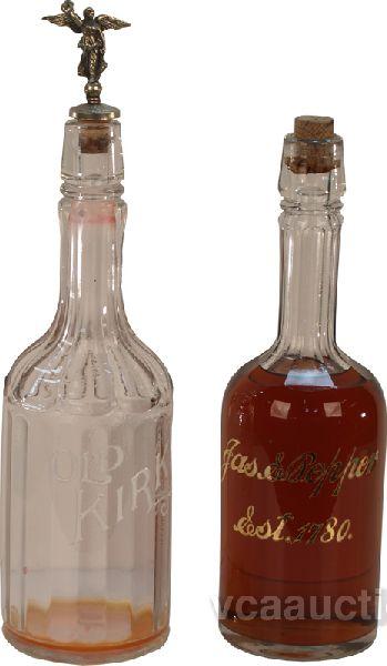 Lot Of 2 Glass Back Bar Bottles: 1 - Old Kirk white enamel lettering w/ unique stopper & 1 - Jas. E. Pepper Est. 1780 gold colored lettering
