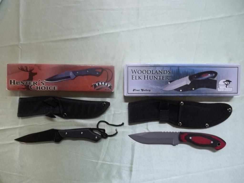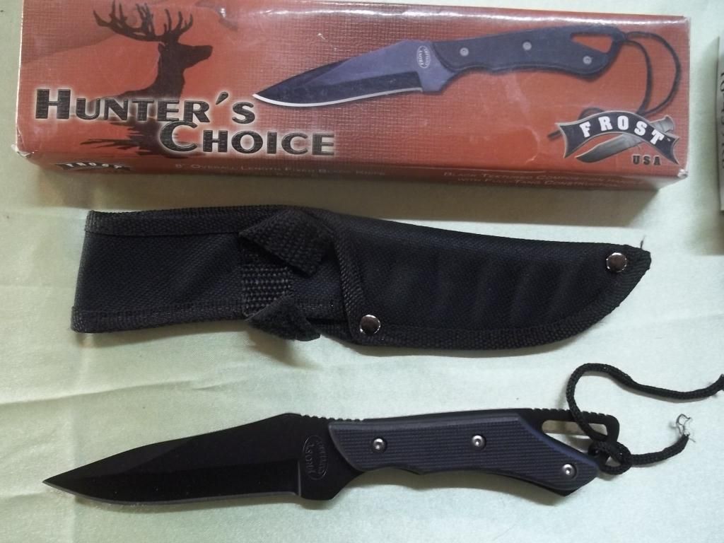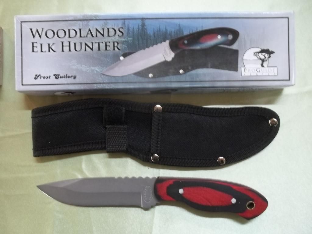 Woodland Elk Hunter 9" Fixed Blade Knife By Frost Cutlery. Hunter's Choice Has Composite Hand W/ Full Tang Construction & Black Nylon Sheath. Woodlands Knife Has Matte Stainless Steel Blade W/ Tang Construction. Red & Black Handle W/ Stainless Steel Rivets & Nylon Sheath