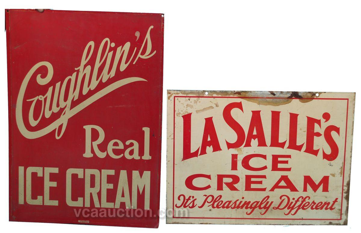 Lot Of 2 Ice Cream Signs: Coughlin's Real Ice Cream Tin Sign - 20" x 28" & La Salle's Ice Cream Double Sided Porcelain Sign - 24" x 18"