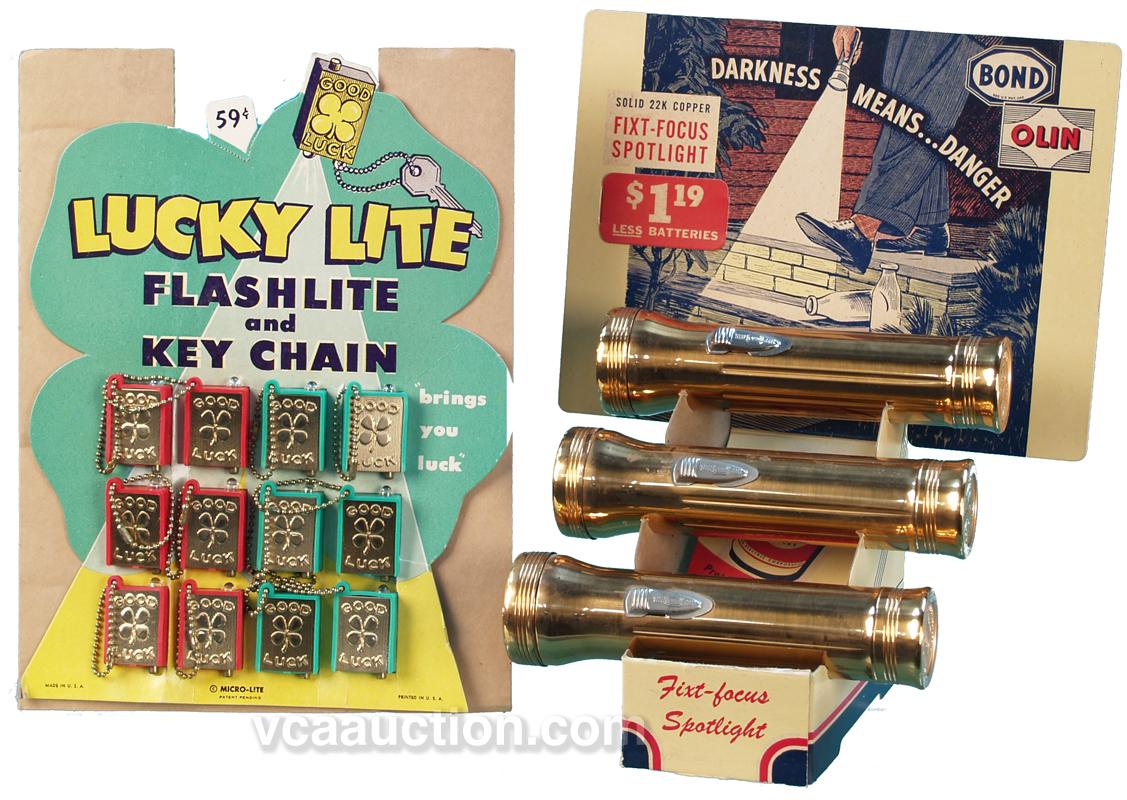 Lot Of 2 Items: Bond Flashlight Countertop Display w/ Product & Lucky Lite Flashlite & Key Chain Countertop Display w/ Product