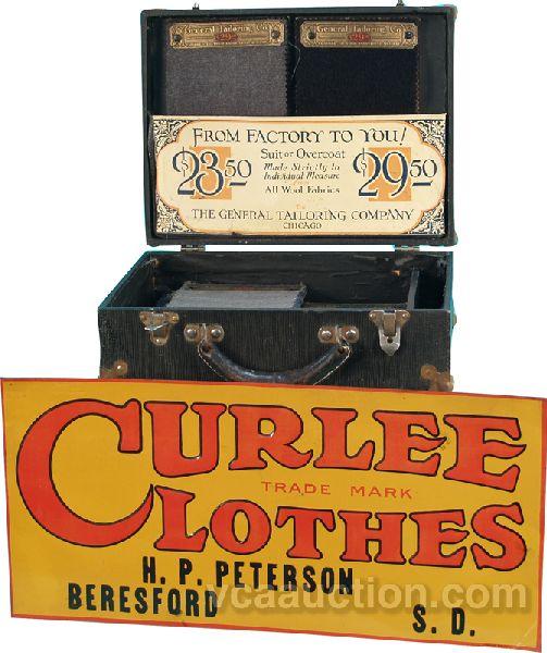 Lot Of 2 Items: The General Tailoring Co. Chicago, traveling salesman case w/ samples & old ruler - 13" x 10" x 4" (closed) & Curlee Clothes Embossed Tin Sign - 19" x 9"