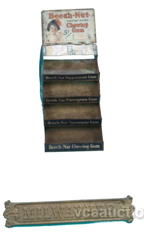 Lot Of 2 Items: 1 - Beech Nut Chewing Gum store countertop tin display (poor condition) & 1 - "Milwaukee" embossed brass sign - 14" x 3"