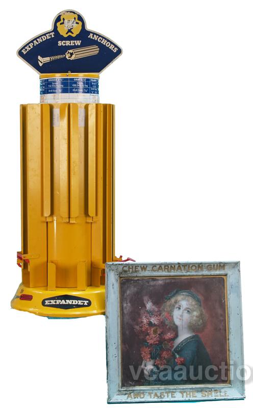 Lot Of 2 Items: 1 - metal hardware store spinning display rack used for screws & 1 - Chew Carnation Gum self-framed tin sign "And Taste The Smell" - 14" x 14"