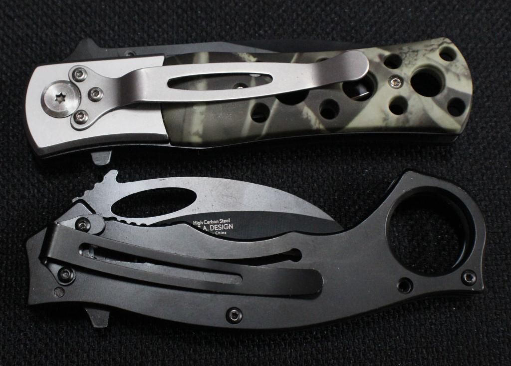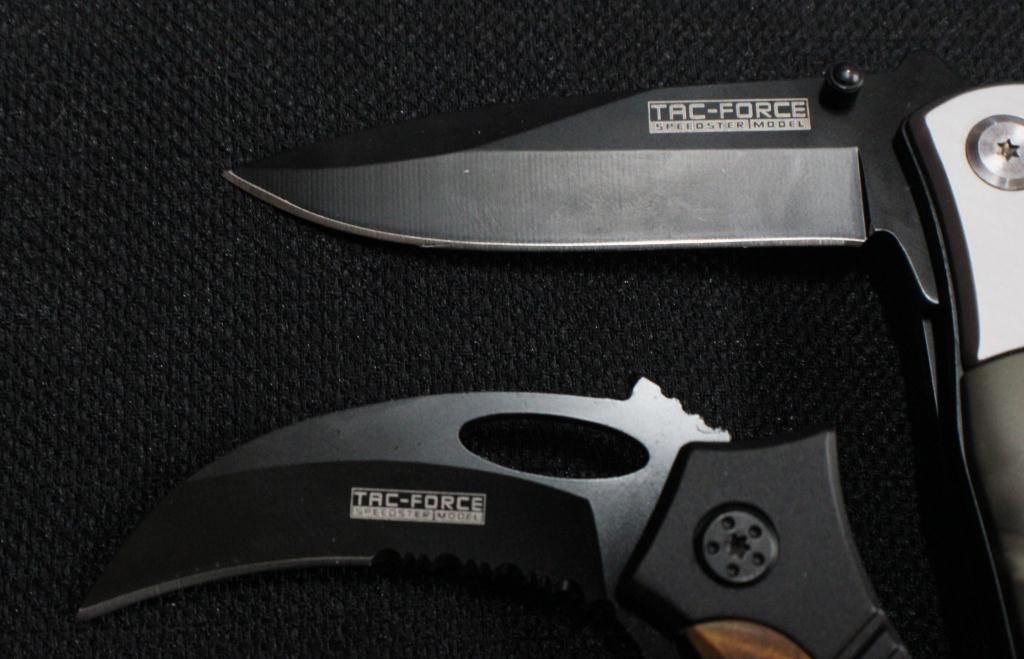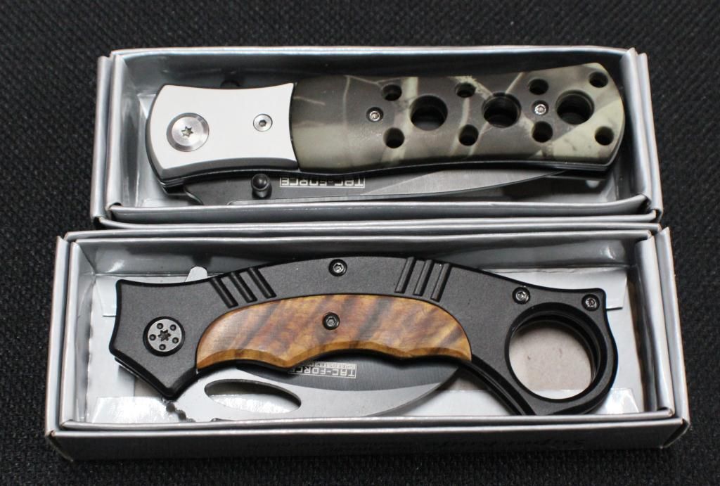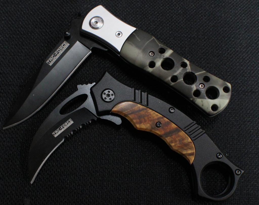 W/Aluminum Handle W/ G-10 Insert, Over A Steel Frame And Black Serrated Stainless Steel Blade. Tac Force Folding Knife W/ Black Stainless Steel Blade & Camo Design Aluminum Handle.