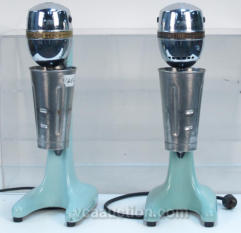 Lot Of 2, Matching Hamilton Beach Green Porcelain Base Malt Mixers w/ cups