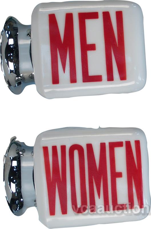 Lot Of 2 Milk Glass Triangular Wall Mount Light-Up Restroom Signs: "MEN" "WOMEN" - N.O.S.