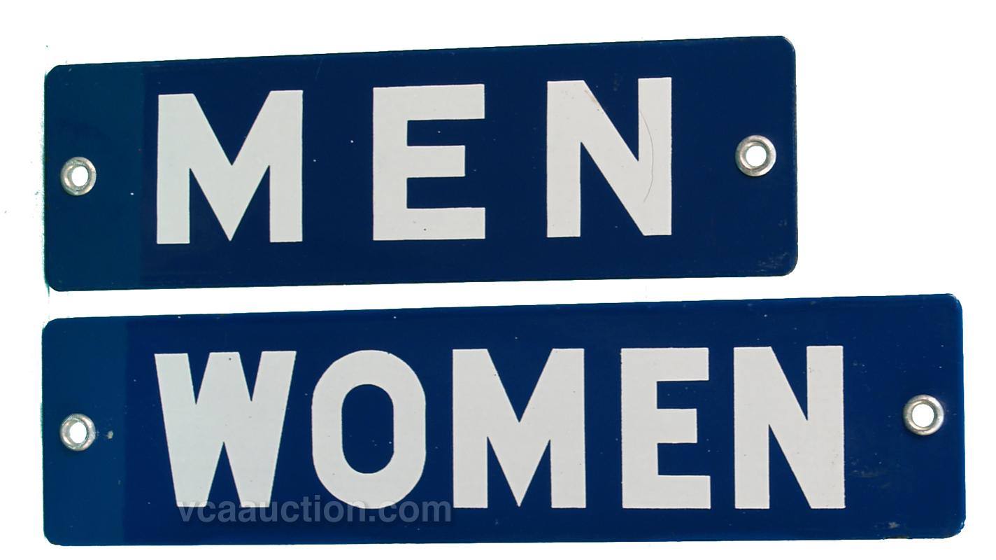 Lot Of 2 Original Gas Station Restroom Porcelain Signs: Men - 10" x 3" & Women - 12" x 3", N.O.S. From The 50's