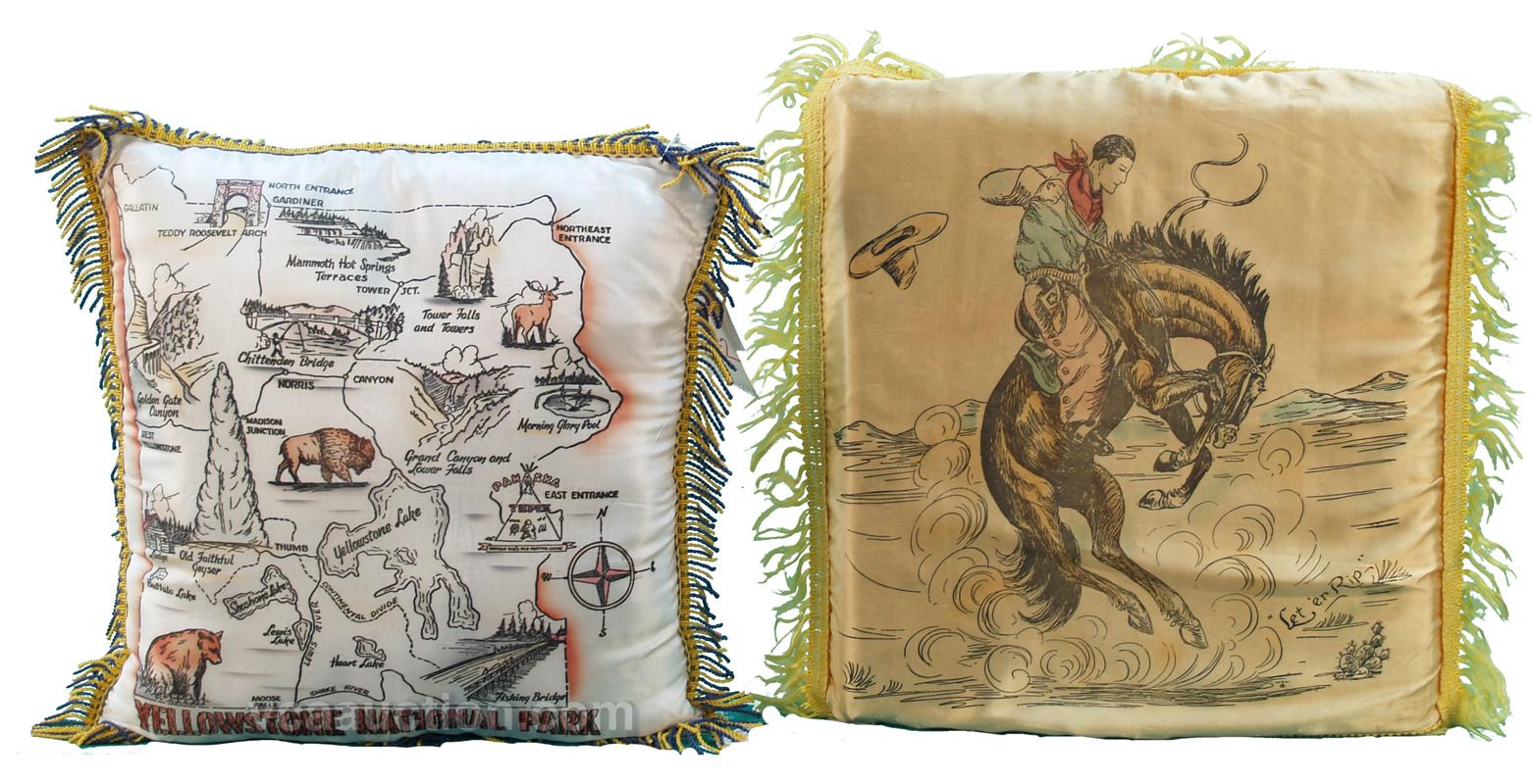 Lot Of 2 Pillows: 1 Yellowstone National Park C 1920's & 1 Bucking Bronco (Silk) "Let 'Er Rip" C. 1920's