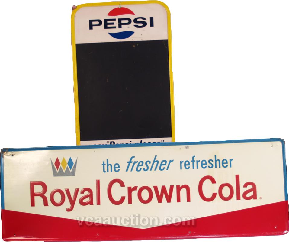 Lot Of 2 Self-Framed Beverage Tin Signs: 1 - "Pepsi" chaulk menu board - 19" x 30" & 1 - embossed "Royal Crown Cola" - 54" x 18"