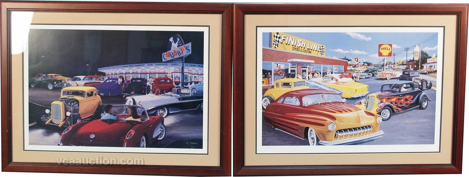 Lot Of 2 Signed Dave Snyder 1950's Scene Prints: 1 - Chubby's diner parking lot, 17/500 & 1 - Shell/Finish Line parking lot, 17/500, in matching frames - each 28" x 21"