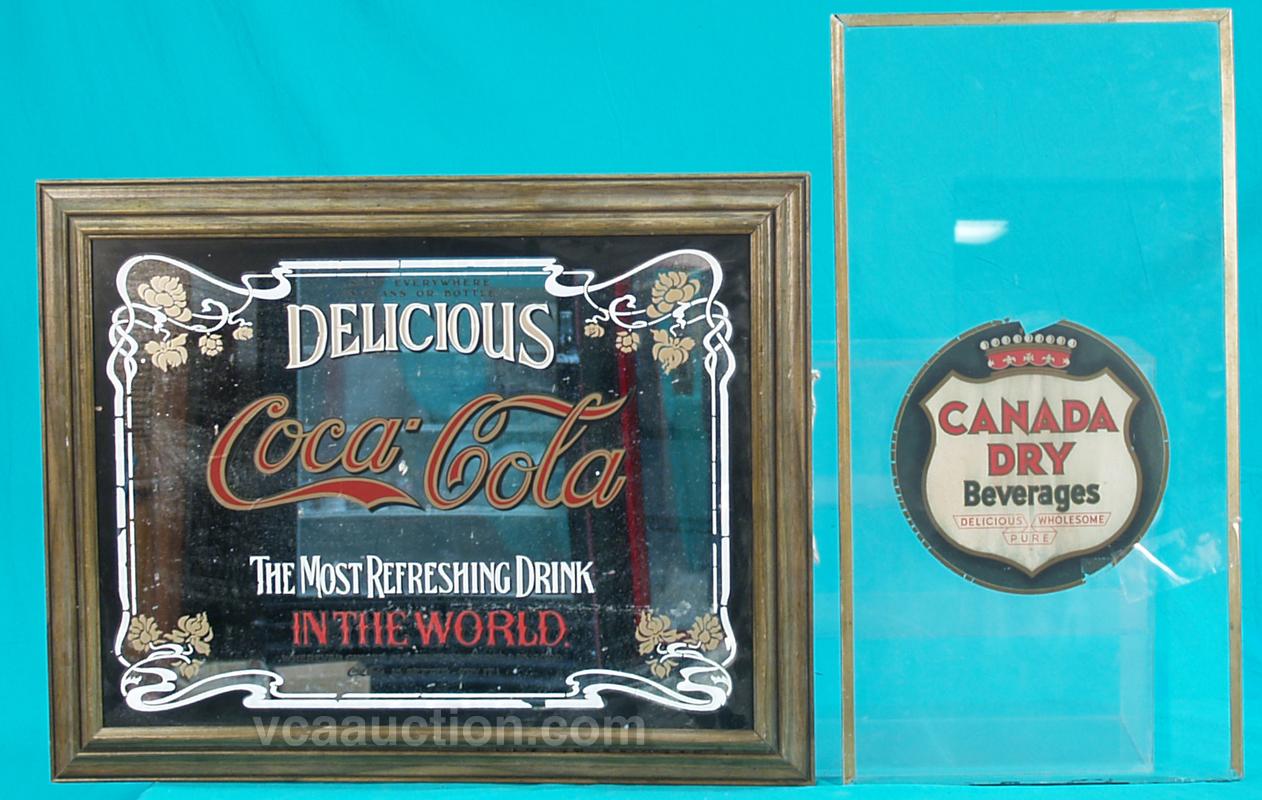 Lot Of 2 Signs: 1 - Delicious Coca Cola advertisement mirror in wood frame - 28" x 22" & 1 - Canada Dry Beverages round decal on glass - 14" x 27" decal - 10" diam