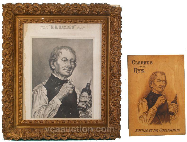 Lot Of 2 Signs: 1 - Clark's Pure Rye wood sign "Bottled By The Government" - 10" x 14" & 1 - "R.B. Hayden" Whiskey paper sign in ornate frame - 20" x 23"