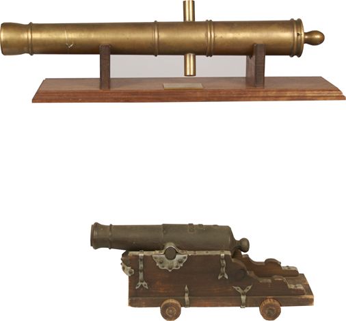 Lot Of 2 Small Cannons: 1 - 18th Century Naval Cannon on wood base w/ plate - 25" long & 1 - French Duppel 1864 Cannon w/ small wooden cart on wheels - 17" long