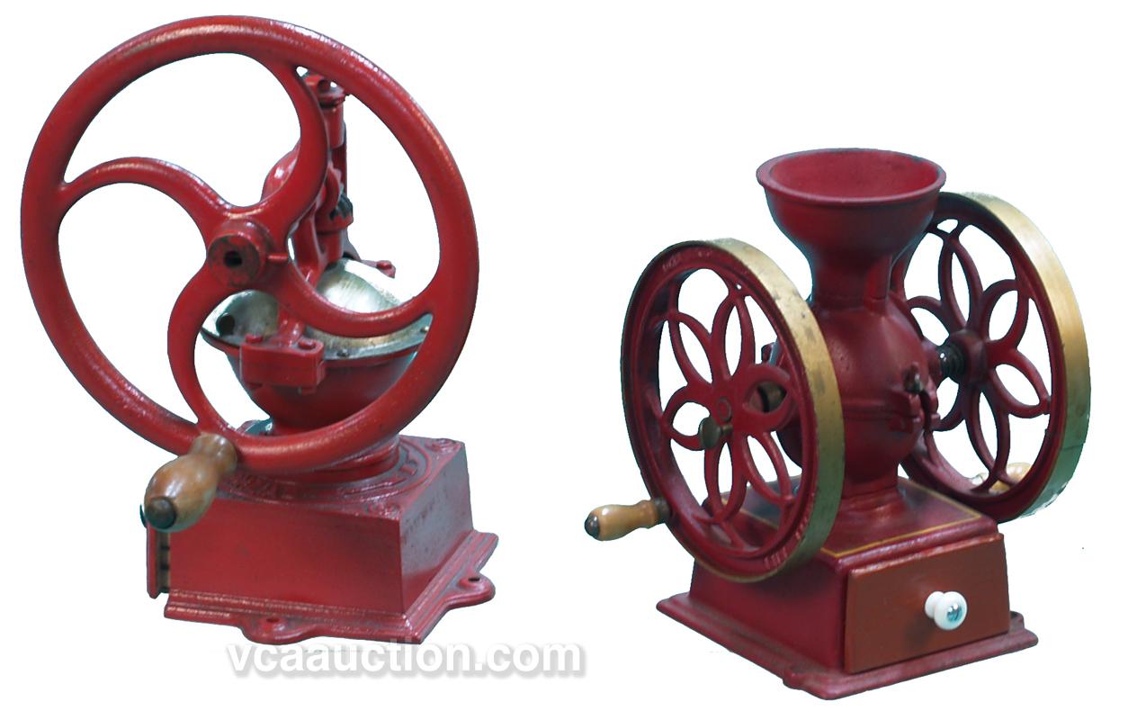 Lot Of 2 Small Cast-Iron Countertop Coffee Grinders: 1 - 2 wheel John Wright Inc. "Coffee Mill" & 1 - single wheel Ampia Garanzia coffee grinder