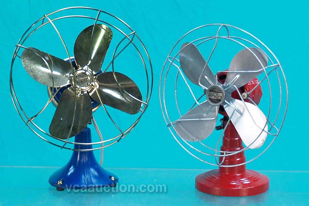 Lot Of 2 Small Electric Countertop Fans: 1 - Electrex by United Drug Co. Boston, St. Louis, USA. red & chrome & 1 - blue & brass (maker unknown)