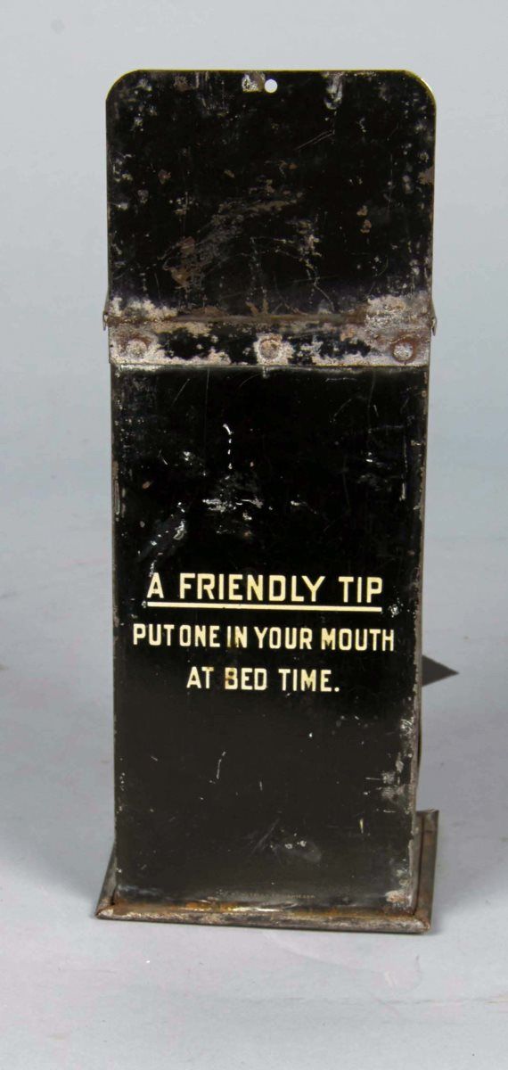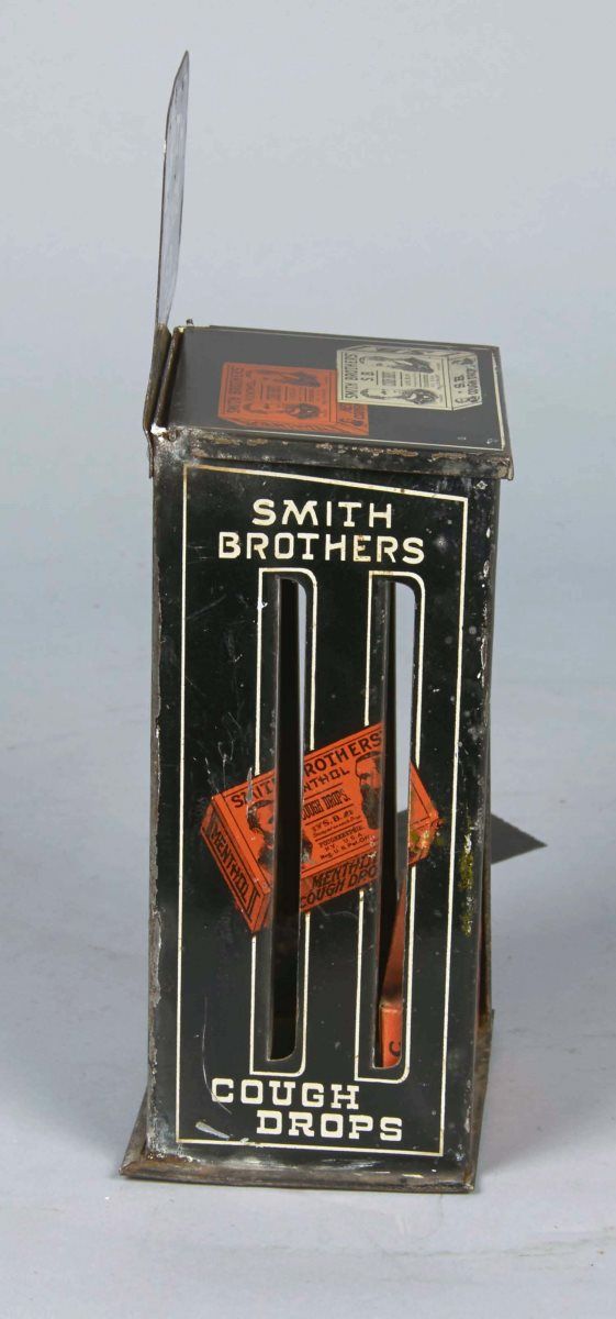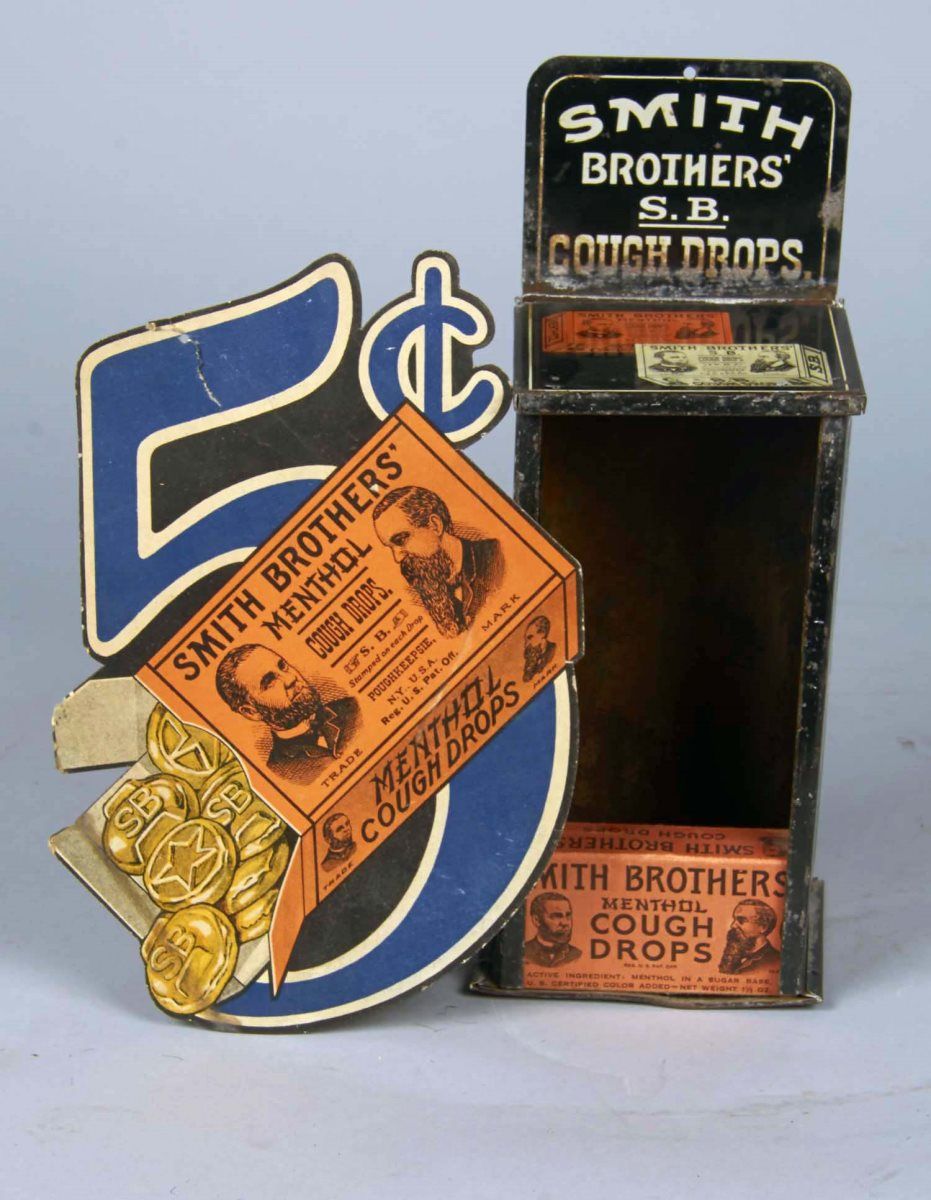 Including 1 - Smith Brothers' tin store display with a box of menthol cough drops. Reads "A friendly tip, put one in your mouth at bed time." Ca. 1920s, and 1 - Die cut Smith Brothers' cough drop display. Ca. 1920s Condition Good Size Largest 10-1/2" x 4"