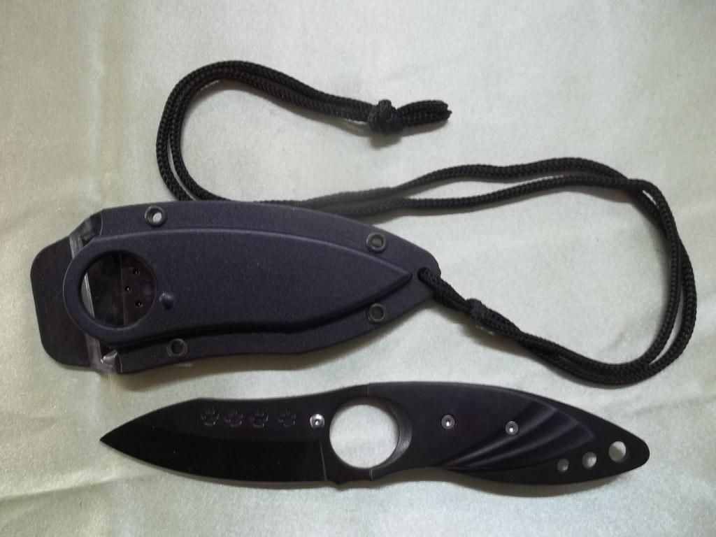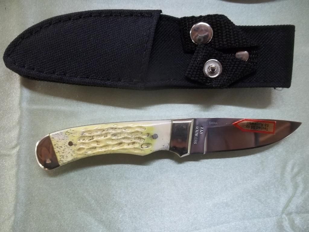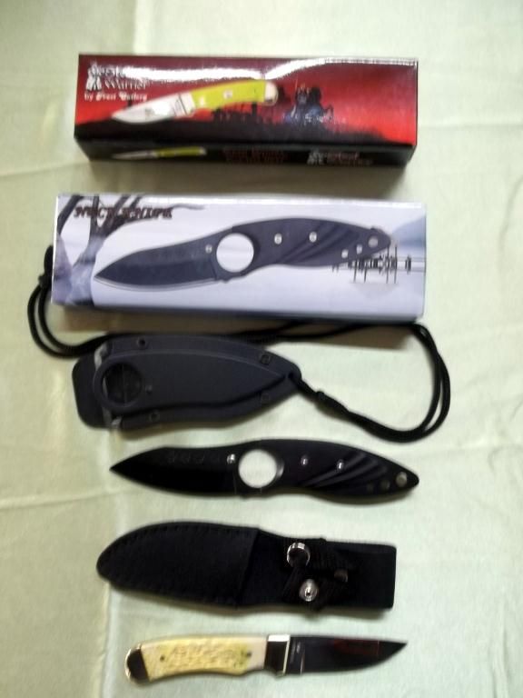 Neck Knife. Neck Knife Has 6.5" Overall, Black Blade, Bear Footprint On Blade, Black Plastic Handle & Sheath With Lanyard. Coon Hunter Is 6" Overall Skinning Knife With Stainless Steel Blade, Nickel Silver Bolsters, Brass Pins & Liners, Imported Bone Handles & Nylon Sheath