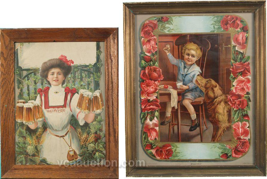 Lot Of 2 Stock Prints: 1 - woman serving nine mugs of beer w/ space for your ad, die-cut cardbaord in frame - 15" x 19" & 1 - young child feeding dog in rose border "Speak For It" w/ space for your ad, in frame - 22" x 18"