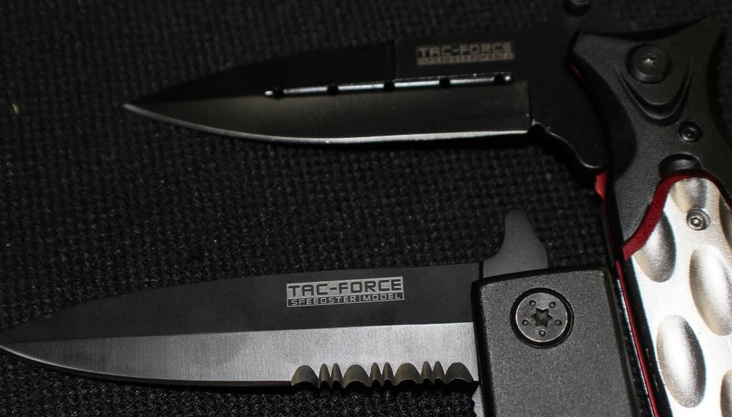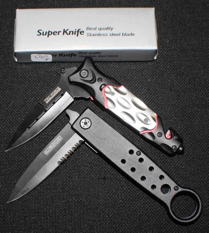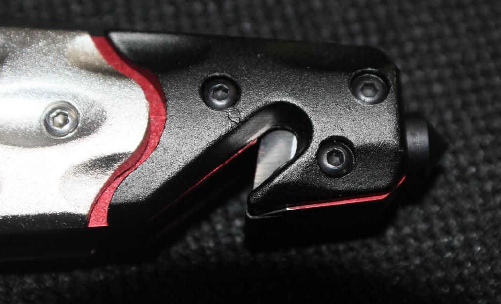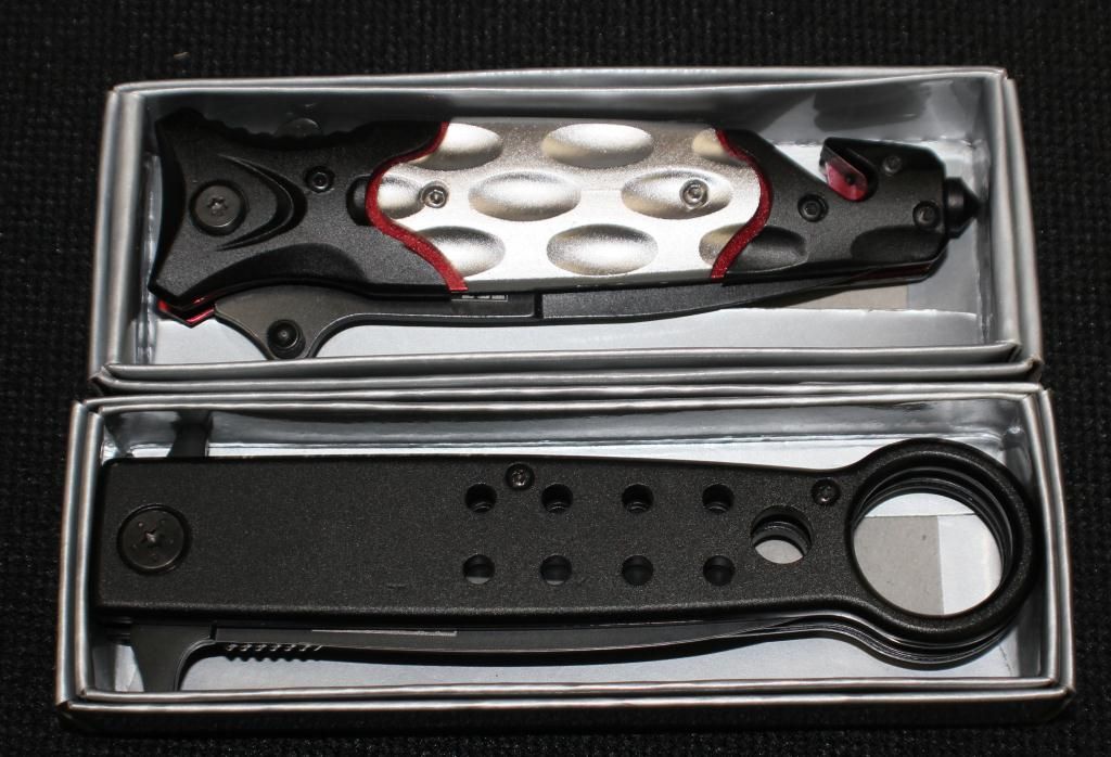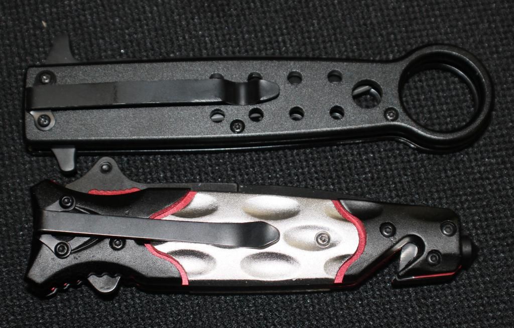 3.25" Spear Headed Stainless Steel Blade, Two one Handle & Seatbelt Cutter, Glass Breaker & Pocket Clip. Action Assist Half Serrated Black Stainless Steel Blade, Metal Handle W/ Ring & Pocket Clip.