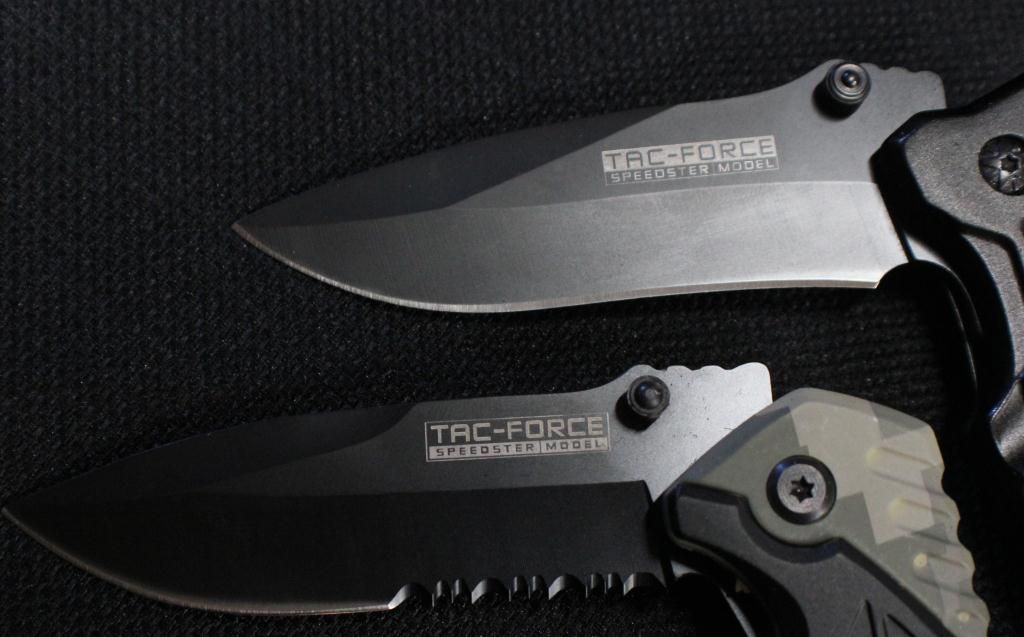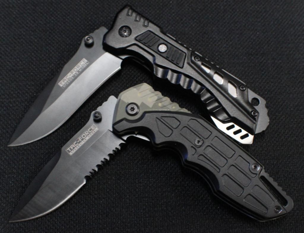 3.25" Serrated Blade, Desert Camo & Black Aluminum Handle W/ Pocket Clip. Tac Force "Star Tac" Folding Knife W/ Black Stainless Steel Blade & Pocket Clip.