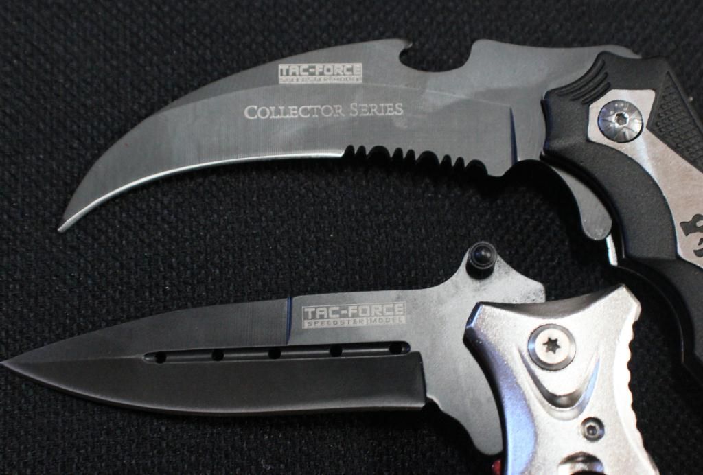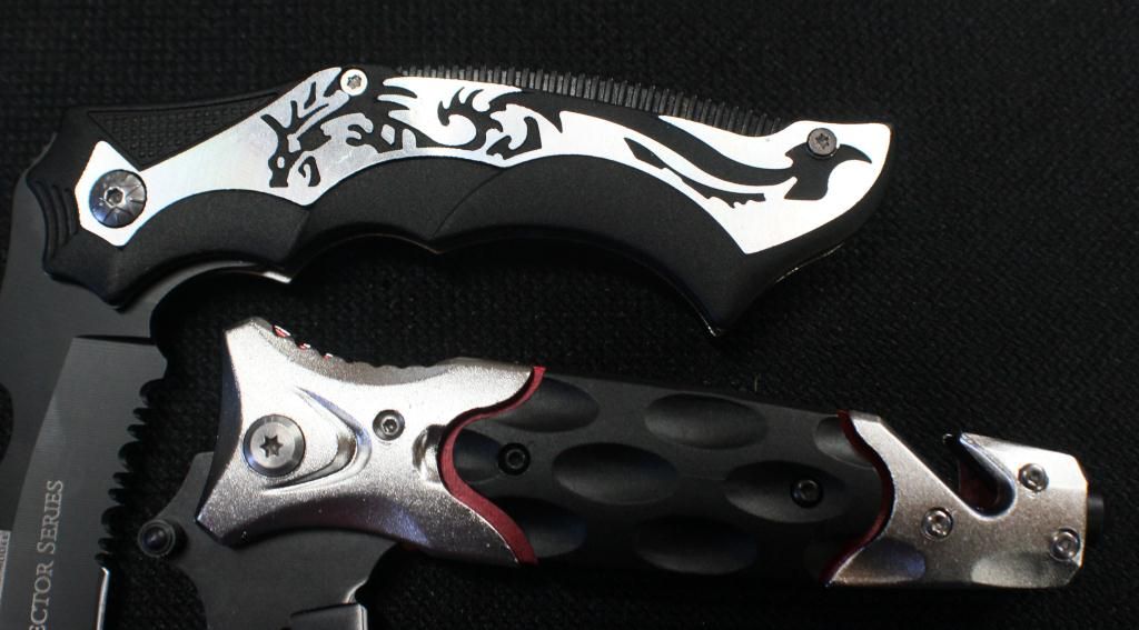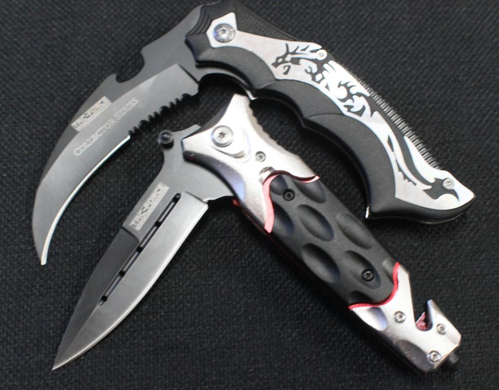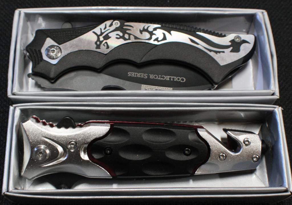 Black 3.25" Spear Headed Stainless Steel Blade & Black & Silver Handle- Pocket Clip, Seatbelt Cutter & Glass Breaker. Collector Series 3.5" Karambit Style Black Coated half Serrated Blade, Silver Dragon Design & Belt Clip