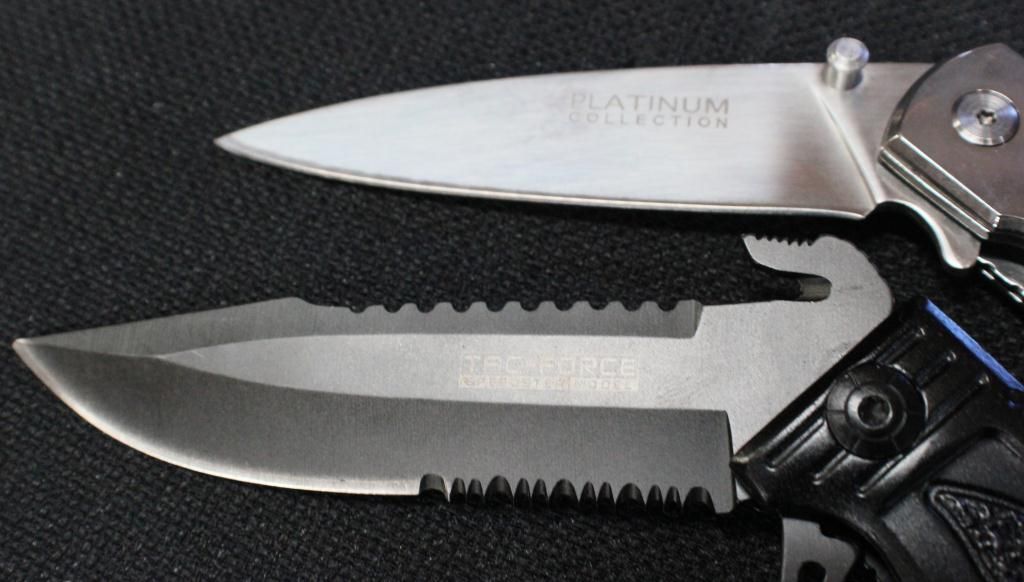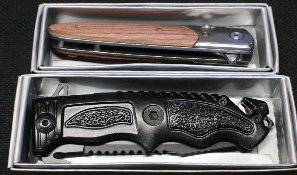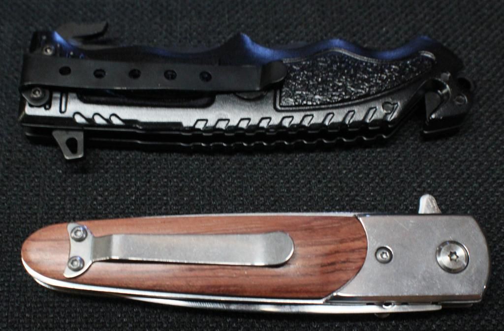 Black Stainless Steel Blade, Black Aluminum Handle, W/Seatbelt Cutter, Glass Breaker, & Pocket Clip. Platinum Collection Folding Knife W/Stainless Steel Blade & Wood Overlay Handle & Pocket Clip.