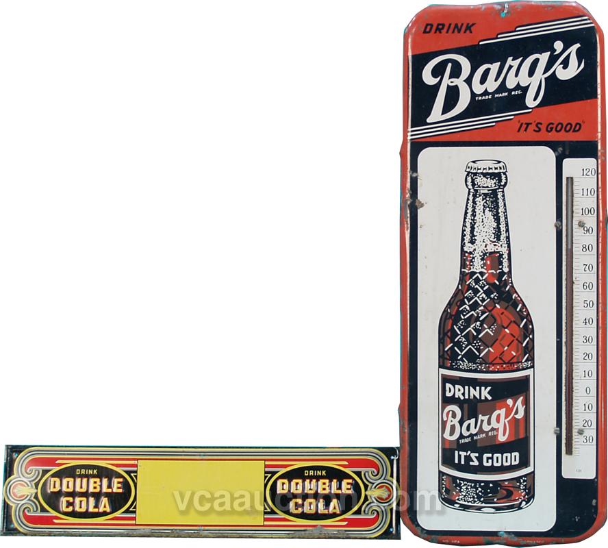 Lot Of 2 Tin Signs: 1 - Drink Double Cola embossed sign - 19" x 4" & 1 - Barq's sign w/ thermometer - 10" x 26"