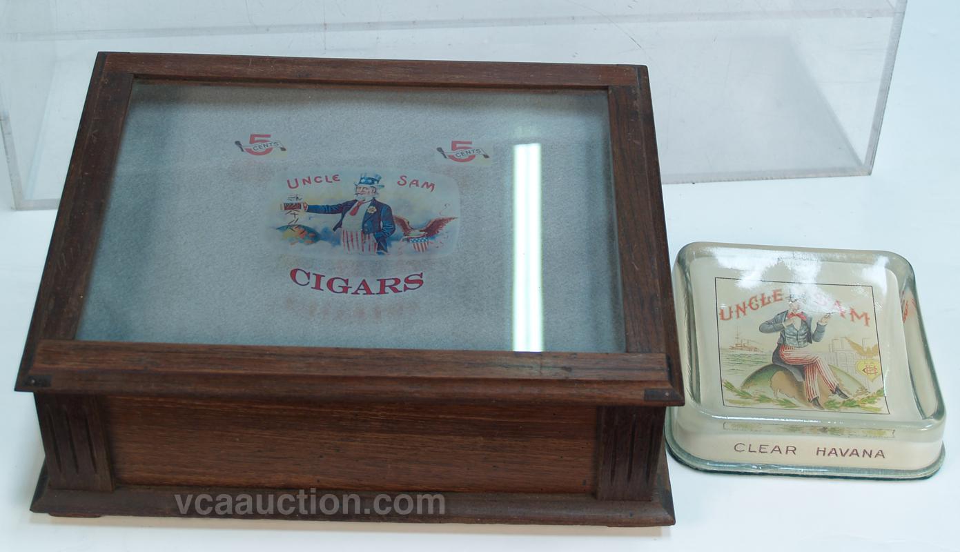 Lot Of 2 Uncle Sam Items: 1 - glass change receiver & 1 - wood & glass store countertop display case - 13" x 10" x 6" tall