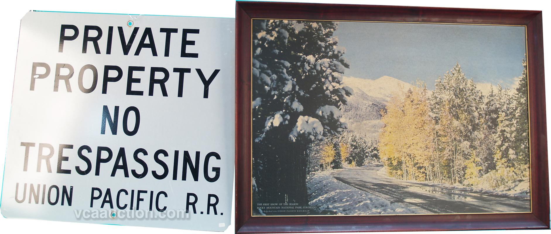 Lot Of 2 Union Pacific Railroad Items: Private Property Illuminated Aluminum Sign - 24" x 22" & "The First Snow Of The Season", Rocky Mountain National Park, CO. - Reached Via Union Pacific Railroad Original Poster Promo & Frame - 33" x 23" (Union Pacific & National Park Collectible)