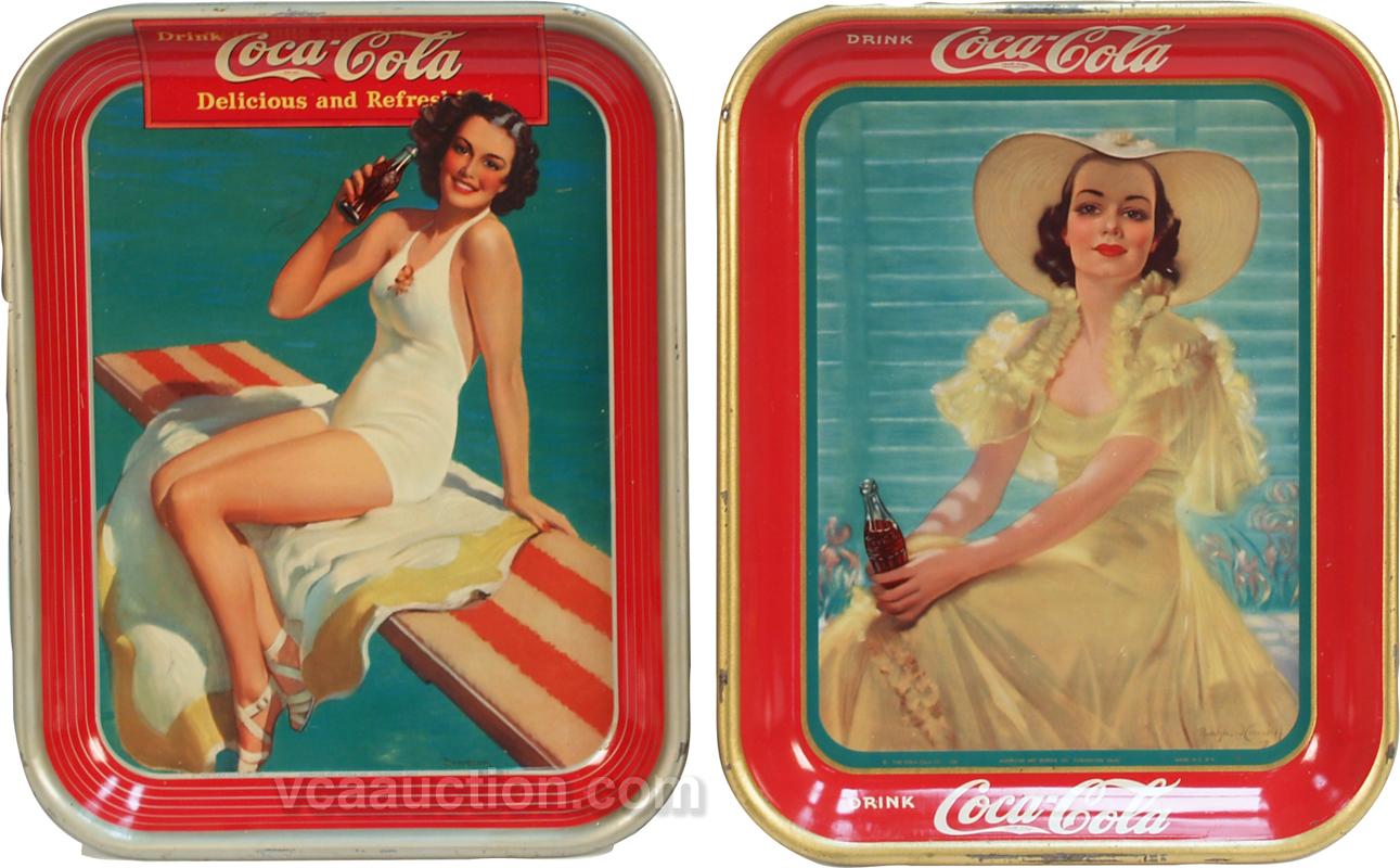 Lot Of 2 Vintage Drink Coca Cola Tin Serving Trays: 1 - 1938 & 1 - Sundblom 1939 - each 10" x 13"