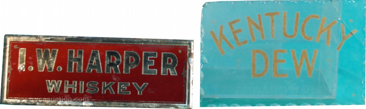 Lot Of 2 Whiskey Glass Signs: 1 - I.W. Harper Whiskey reverse glass sign - 16" x 6" & 1 - Kentucky Dew glass sign w/ scalloped edges (crack in right hand corner) - 14" x 9"