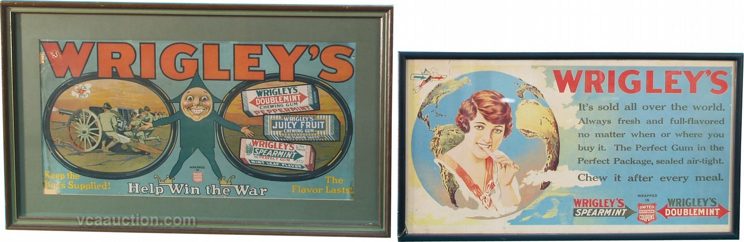 Lot Of 2 Wrigley Gum "Trolley" Paper Signs In Frames: 1 - "Keep The Boys Supplied - Help Win The War" c1918 w/ "arrow" man - 20" x 10" & 1 - Spearmint & Doublemint w/ globe - 21" x 10" (each sign "Wrapped In United Profit Sharing Coupons")