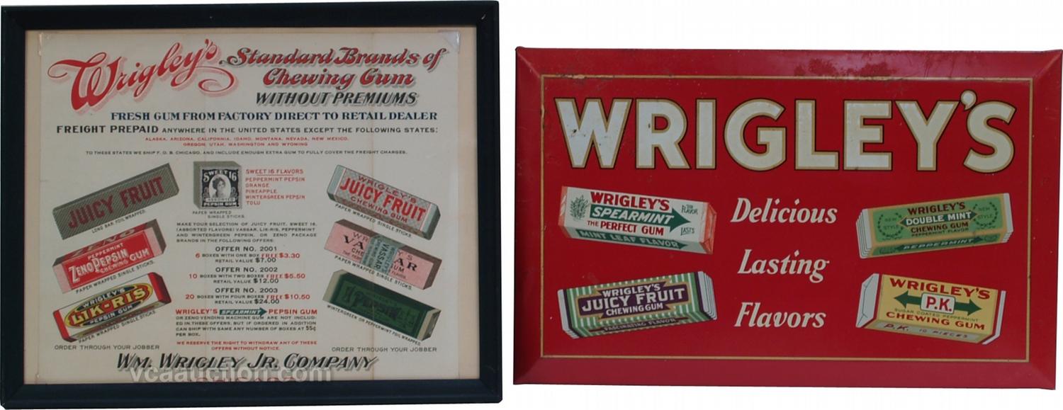 Lot Of 2 Wrigley's Gum Advertisement Signs: 1 - Wrigley tin sign over cardboard ad - 11" x 7" & 1 - Wrigley paper ad for 7 different flavors of gum - 9" x 7"